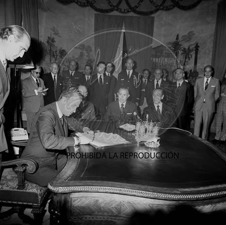 El Príncipe de España D. Juan Carlos, firma por primera vez como Jefe del Estado, por enfermedad del Caudillo, con motivo de la firma del convenio con EE.UU.