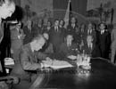 El Príncipe de España D. Juan Carlos, firma por primera vez como Jefe del Estado, por enfermedad del Caudillo, con motivo de la firma del convenio con EE.UU.