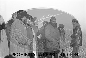 Víctor de la Serna, Infante de Baviera y García Sanchíz visitan el frente de Teruel, grupo alrededor de una hoguera con el General Aranda