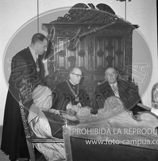 Franco conversando con el Cardenal Primado de España y con miembros del Gobierno, en el claustro de la Universidad de Salamanca