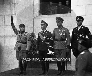 Musolini preside un desfile militar en Roma con la asistencia de su Ministro del Interior y de Serrano Suñer, Ministro de Asuntos Exteriores de España.