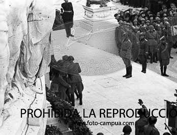 Musolini preside un desfile militar en Roma con la asistencia de su Ministro del Interior y de Serrano Suñer, Ministro de Asuntos Exteriores de España.