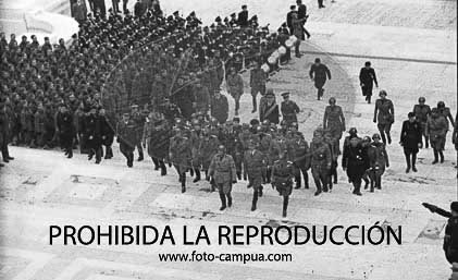 Musolini preside un desfile militar en Roma con la asistencia de su Ministro del Interior y de Serrano Suñer, Ministro de Asuntos Exteriores de España.