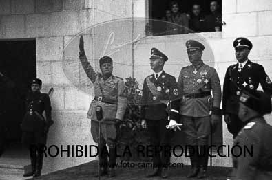 Musolini preside un desfile militar en Roma con la asistencia de su Ministro del Interior y de Serrano Suñer, Ministro de Asuntos Exteriores de España.