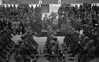 Musolini preside un desfile militar en Roma con la asistencia de su Ministro del Interior y de Serrano Suñer, Ministro de Asuntos Exteriores de España.