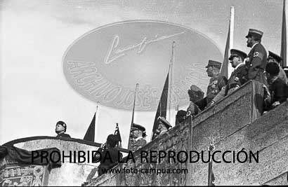 Musolini preside un desfile militar en Roma con la asistencia de su Ministro del Interior y de Serrano Suñer, Ministro de Asuntos Exteriores de España.