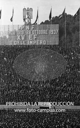 Musolini preside un desfile militar en Roma con la asistencia de su Ministro del Interior y de Serrano Suñer, Ministro de Asuntos Exteriores de España.