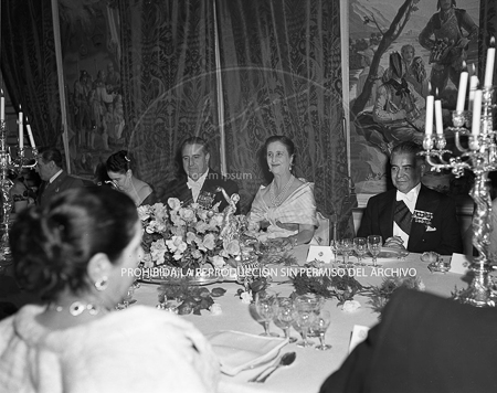 Cena de gala ofrecida en el Palacio de El Pardo, con motivo de la visita de la esposa del Presidente Oria del Perú, Dª Maria Delgado Romero.