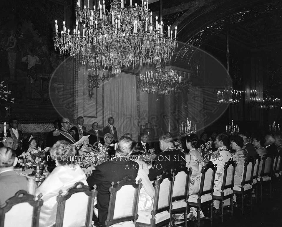 Cena de gala en el Palacio de Oriente en honor del Sha de Persia, Reza Pahlavi y su esposa Soraya Estafandrani