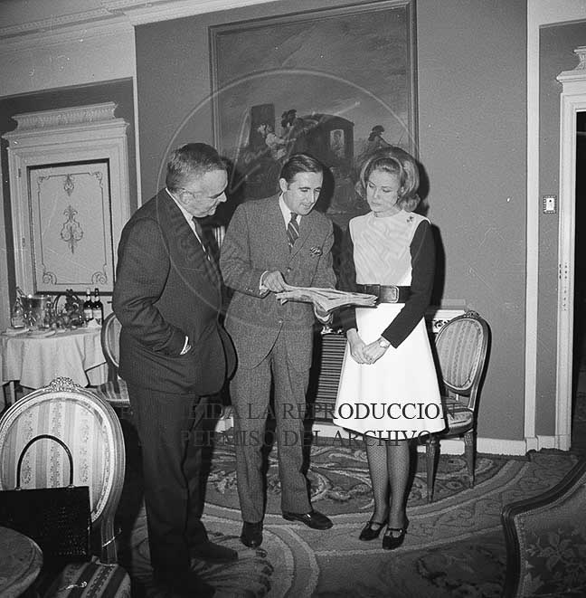 Los Principes Rainiero y Grace de Monaco en el hotel Palace de Madrid con el periodista Jaime Peñafiel, ojean las fotos Campua que se han publicado en la revista HOLA con motivo de su visita a España.