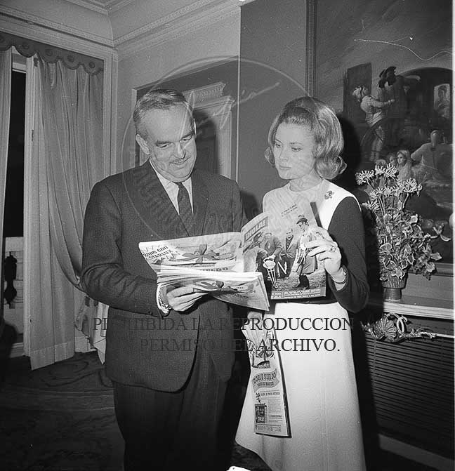 Los Principes Rainiero y Grace de Monaco en el hotel Palace de Madrid con el periodista Jaime Peñafiel, ojean las fotos Campua que se han publicado en la revista HOLA con motivo de su visita a España.