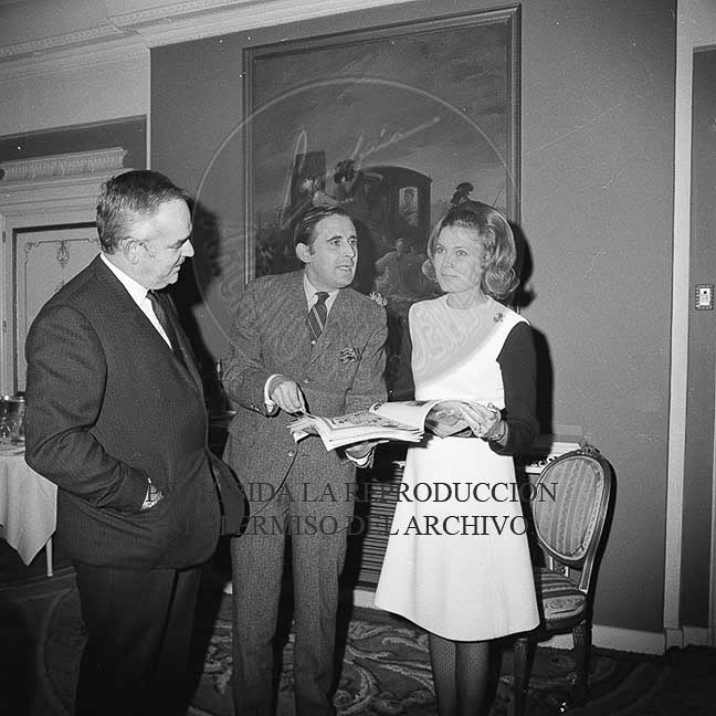 Los Principes Rainiero y Grace de Monaco en el hotel Palace de Madrid con el periodista Jaime Peñafiel, ojean las fotos Campua que se han publicado en la revista HOLA con motivo de su visita a España.