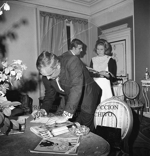 Los Principes Rainiero y Grace de Monaco en el hotel Palace de Madrid con el periodista Jaime Peñafiel, ojean las fotos Campua que se han publicado en la revista HOLA con motivo de su visita a España.