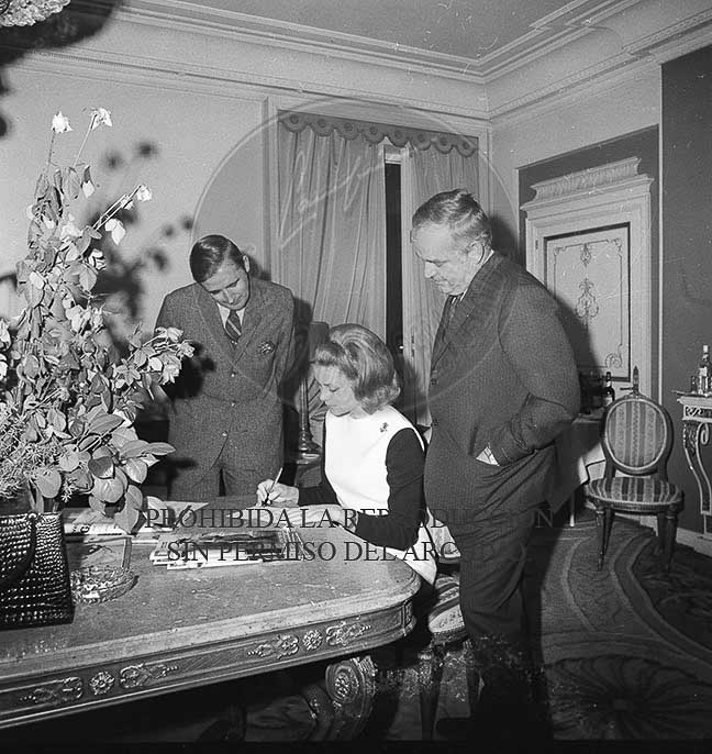 Los Principes Rainiero y Grace de Monaco en el hotel Palace de Madrid con el periodista Jaime Peñafiel, ojean las fotos Campua que se han publicado en la revista HOLA con motivo de su visita a España.