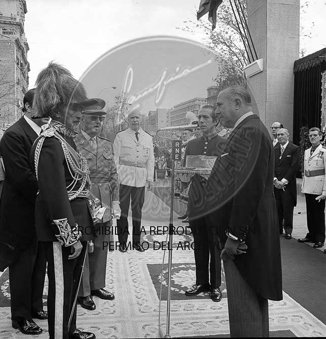 Haile Selasie, Emperador de Etiopia, El Negus, visita oficialmente España. Entrega de las llaves de Madrid por el alcalde Sr. Arias Navarro, recepcion en El Pardo