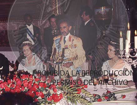 Haile Selasie, emperador de Etiopia, El Negus, visita oficialmente España. Cena de gala en el Palacio de Oriente, con asistencia de los Principes de España.