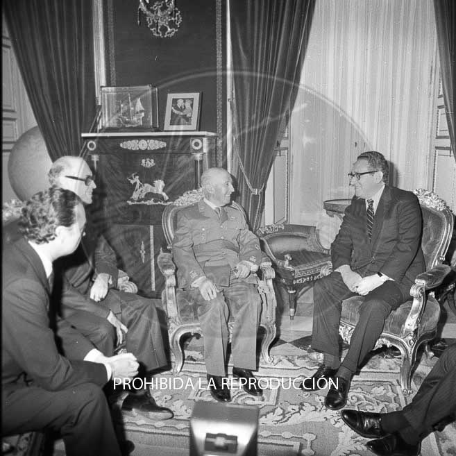 El Secretario de Estado de Exteriores Mr. Henry Kissinger, acompañado del Ministro de AA.EE. españón Sr. López Rodó, es recibido en El Pardo por el Jefe del Estado Francisco Franco.