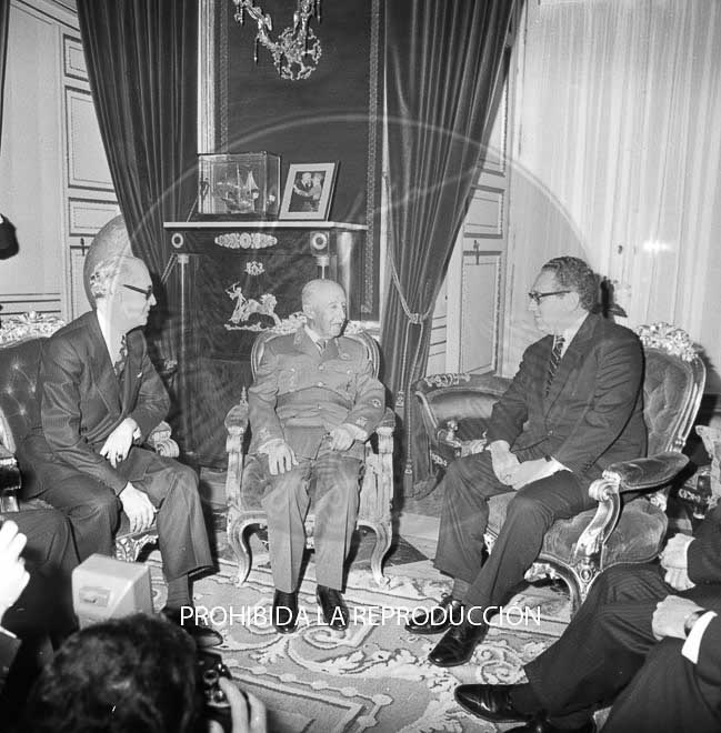 El Secretario de Estado de Exteriores Mr. Henry Kissinger, acompañado del Ministro de AA.EE. españón Sr. López Rodó, es recibido en El Pardo por el Jefe del Estado Francisco Franco.